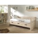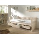 Under sengen finder du tre rummelige skuffer, der holder sengetøj, legetøj eller tøj samlet og nemt tilgængeligt. Sengebunden med lameller er inkluderet, så sengen er klar til brug med en madras i størrelsen 90 x 200 cm. Den naturlige, lakerede finish fremhæver træets varme udtryk og gør sengen let at matche med andre møbler.