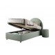 Den matchende grønne puf er et dekorativt blikfang. Den kan bruges som ekstra siddeplads, fodskammel eller som et trendy natbord ved siden af sengen, så bog og telefon altid er inden for rækkevidde. Kombinationen af den bløde polstring, afrundet sengegavl og dæmpede pasteltoner gør sættet ideelt til soveværelset, gæsteværelset eller et hyggeligt læsehjørne.