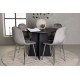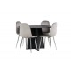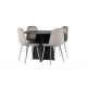 Velkommen til et Spisebordssæt, der kombinerer stil og funktionalitet på en måde, der vil løfte din indretning til nye højder. Vores runde spisebord Bootcut bliver hurtigt det perfekte midtpunkt for dine fremtidige middagsselskaber. Med sin tidsløse sorte farve og runde form skaber det en øjeblikkelig følelse af elegance og tilhørsforhold - her ender ingen på kanten. Bordet er lavet af sort MDF med finer, og den robuste base giver god stabilitet til bordet samtidig med, at det bidrager til et visuelt slående design. Bordet måler 110 cm i diameter. Men et Spisebordssæt er ikke komplet uden komfortable stole, og her kommer stolene fra Eva-serien ind i billedet. Deres lysegrå velourstof harmonerer smukt med den elegante sorte farve på Bootcut-bordet og skaber en trendbevidst kontrast, der fremkalder en følelse af luksus og modebevidsthed. Benene er i kromsølv, hvilket tilføjer et moderne touch til det samlede udseende. Men selvfølgelig er de ikke kun stilfulde, men også utroligt komfortable at sidde på. Med dette Spisebordssæt får du det bedste af begge verdener. Så hvorfor vente? Skab uforglemmelige middage og mindeværdige øjeblikke med dette fantastiske runde Spisebordssæt. Her behøver du ikke at gå på kompromis mellem stil og komfort!