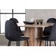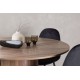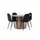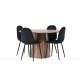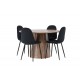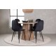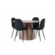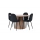Indret smukt, smart og stilfuldt med et moderne Spisebordssæt i træmateriale og velourstof – den perfekte kombination af luksus og komfort! Vores træfarvede spisebord Lanzo har et konsistent design med en rund top lavet af tynd MDF. Den snoede cylinderformede base, centralt placeret under bordet, tilføjer et øjekast og skaber bevægelse i rummet. Den naturlige farve fremhæver også elegant materialets mønster. Bordet har en diameter på 120 cm. Sammen med det træfarvede spisebord Leo tilbyder vi vores sorte spisebordsstole Polar. Disse stole er omhyggeligt designet og tilbyder en perfekt balance mellem stil og komfort. De har et fuldt polstret design, og sædet er lavet af blødt sort velourstof, hvilket giver en luksuriøs følelse. De sort pulverlakerede metalben tilføjer et moderne touch og sikrer god stabilitet. Inviter nære venner og familie til hyggelige måltider, hvor ingen risikerer at ende på kanten!