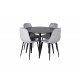 Et Spisebordssæt i moderne og stilfuldt design. Spisebordet Plaza og spisestolene Polar er den perfekte kombination til hjemmets hjerte, som sandsynligvis passer lige så godt til dine behov som til din øvrige indretning. Bordpladen er lavet af MDF og har en elegant sort farve, mens stolene er betrukket med polyesterfløjl i en smuk grå nuance. Dette sæt tilføjer en sofistikeret atmosfære til dit spisestueområde.