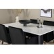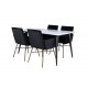 Klassisk, stilfuld og praktisk - Jimmy spisestuesæt er et sikkert valg til alle lejligheder! Med en udtrækkelig topplade i hvid HPL og MDF finer samt let skrånende ben i sort metal, passer dette bord perfekt til alle indretningsstile og hjem. Bordmål: Længde udtrækkelig mellem: 150 cm og 240 cm, Bredde: 90 cm, Højde: 76 cm. Matchet her med 6 Petra spisebordsstole i luksuriøst design. Den indbydende sæde er i sort fløjlstof, og stolbenene er dekorative i kobberfarvet jern. Stolemål: Højde: 87 cm, Sædehøjde: 48 cm, Bredde: 57 cm, Dybde: 60 cm. Her sidder du og dine gæster komfortabelt i timevis!