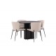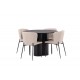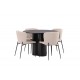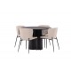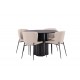 Skab en indbydende atmosfære i dit hjems hjerte med denne stilfulde Spisebordssæt! Stolene er fra Modesto-serien og har en polstring i beige, fluffy bouclé-stof og minimalistiske ben i sort metal. Den let afrundede ryg og den polstrede sædepude giver ekstra komfort. Her i en fantastisk kombination med spisebordet Olivia. Bordet har et holistisk design i sort MDF med en tynd, rund top og tre cylinderformede ben, der er samlet under midten af bordet. Farven har en let dække på den finerede plade, hvilket gør materialets mønster synligt. Det skal føles godt at sætte sig ned til et dejligt måltid!