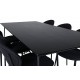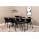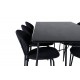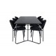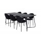 En elegant fuldsort Spisebordssæt i moderne design! Spisebordet Petra har et gennemtænkt design med skandinaviske former, der giver en stilfuld følelse. Bordet har smalle, let skrånende ben i jern og en bordplade i sort MDF med finer. Bordmål: Længde: 190 cm, Bredde: 90 cm, Højde: 75 cm. Her sammen med 6 stk. spisestole i enkelt design, metalstoleben og sorte sæder i polyester. Stolmål: Højde: 80 cm, sædehøjde: 49 cm, bredde: 46 cm, dybde: 61,5 cm. Lad hjemmets hjerte blive prydet af denne iøjnefaldende Spisebordssæt.