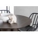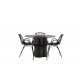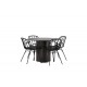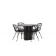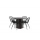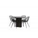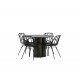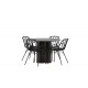 Skab en trendy atmosfære i hjertet af dit hjem! Spisebordet Olivia imponerer med sit skandinaviske design og smagfulde udseende. Bordet har en helhedsorienteret slank mocca farve. Den runde bordplade er lavet af MDF og stellet består af tre cylinderformede ben, der er samlet under midten af bordet. Her sammen med spisebordsstole fra serien Dyron. Denne dejlige spisebordsstol er lige så stilfuld som den er praktisk, fremstillet af sort plastik og stål. Stolen har integrerede armlæn og et ribbet design i den let rundede ryg. Lad tiden her være dagens højdepunkt!