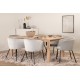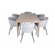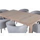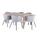 Vores populære spisebordsstole Berit i luksuriøst design forlænger de behagelige middagstunder! Stolen har en generøs sædedybde med et sæde i lysgrå fløjl og stilfulde smalle stoleben i sort jern. Stoledimensioner: Højde: 78 cm, sædehøjde: 49 cm, bredde: 55 cm, dybde: 55 cm. Her matches 6 spisebordsstole med Slider, et udtrækkeligt spisebord i neutral design, der nemt passer ind i de fleste indretningsstile. Bordpladen er knoglehvid i egefiner med spånplade og bordben i eg. Borddimensioner: Længde udtrækkelig mellem: 170 cm og 250 cm, bredde: 95 cm, højde: 75 cm.