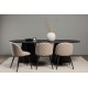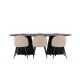 Moderne og indbydende! Vores ovale spisebord Bootcut har et unikt design med en oval bordplade i sort MDF med finer og et karakteristisk stel med to kegleformede ben i åben design. Her i en trendy kombination med spisestole fra Velvet Stitches-serien. Stolens ryg er afrundet og, ligesom sædet, blødt polstret i beige polyesterlinned med dekorative syninger og et skakternet mønster på ryggen. Benene er let udadbuet i sort jern. Det skal føles behageligt at sætte sig ned til middag! Bordmål: 230x115cm.