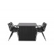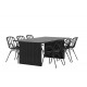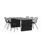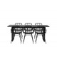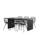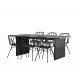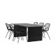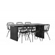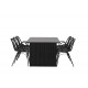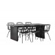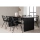En komplet sort spisebordssæt, der står tidens test! Vail spiseborde har lige nordiske former og er lavet af holdbart sort MDF - lige så stilfuldt som praktisk. Bordpladen er tynd i et rektangulært design og balancerer på to robuste træplader, der udgør understellet. Her i perfekt match med vores moderne spisebordsstole fra Dyron serien. Stolen er lige så stilfuld som praktisk, lavet af sort plast og stål. Stolen har integrerede armlæn og et ribbedesign i den let afrundede ryg. Inviter dine kære til flere sociale øjeblikke fremover!