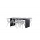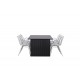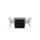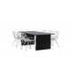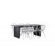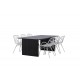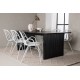 Indret stilfuldt og moderne med et Spisebordssæt, der står tidens prøve! Vail spiseborde har lige nordiske former og er lavet af holdbart sort MDF - lige så stilfuldt som praktisk. Bordpladen er tynd i et rektangulært design og balancerer på to robuste træplader, der udgør understellet. Her i perfekt match med vores moderne spisebordsstole fra Dyron serien. Stolen er lige så stilfuld som praktisk, lavet af greige plast og stål. Stolen har integrerede armlæn og et ribbet design i den let rundede ryg. Inviter dine gæster til mange sociale stunder fremover!