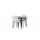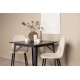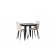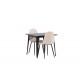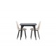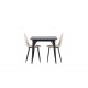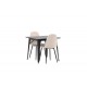 Et charmerende Spisebordssæt til to - perfekt til det lille køkken! Dette spisebord fra Tempe-serien har et klassisk, firkantet design og en tidløs sort farve. Bordpladen er i sort MDF, og bordbenene er i sort metal. Her i en smagfuld kombination med to spiseborde fra Polar-serien i en champagnefarvet nuance. Stolene har et fuldt polstret design med en rund ryg og sæde i beige velourstof med blød polstring og ben i sort pulverlakeret metal. Undgå at gå på kompromis mellem komfort og design!